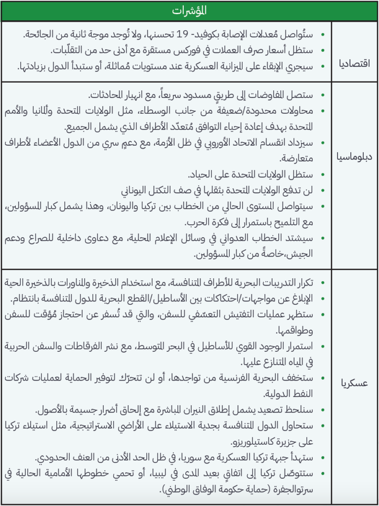 وقد شهدنا بالفعل كیف أخطأت مصر والإمارات وروسیا في تقدیر استعداد تركیا لتخصیص أصولها العسكریة من أجل المواجهة علىالخطوط الأمامیة في ليبيا. فمثلاً، ربما تحاول تركیا اتخاذ خطوات سریعة على الجزر والمناطق الاستراتیجیة القريبة منها من أجل زیادةنفوذها ووجودها. وفي حال سعت إحدى دول منتدى غاز شرق المتوسط إلى اختبار صبر الأخرى بدعم المحاولات العنیدة لعملیات الغازداخل المیاه الإقلیمیة المتنازع علیها؛ فقد یؤدي ذلك إلى انتقامٍ غیر متوقّع، مما قد یُسفر في النهایة عن دائرةٍ مُفرغة من العنف.