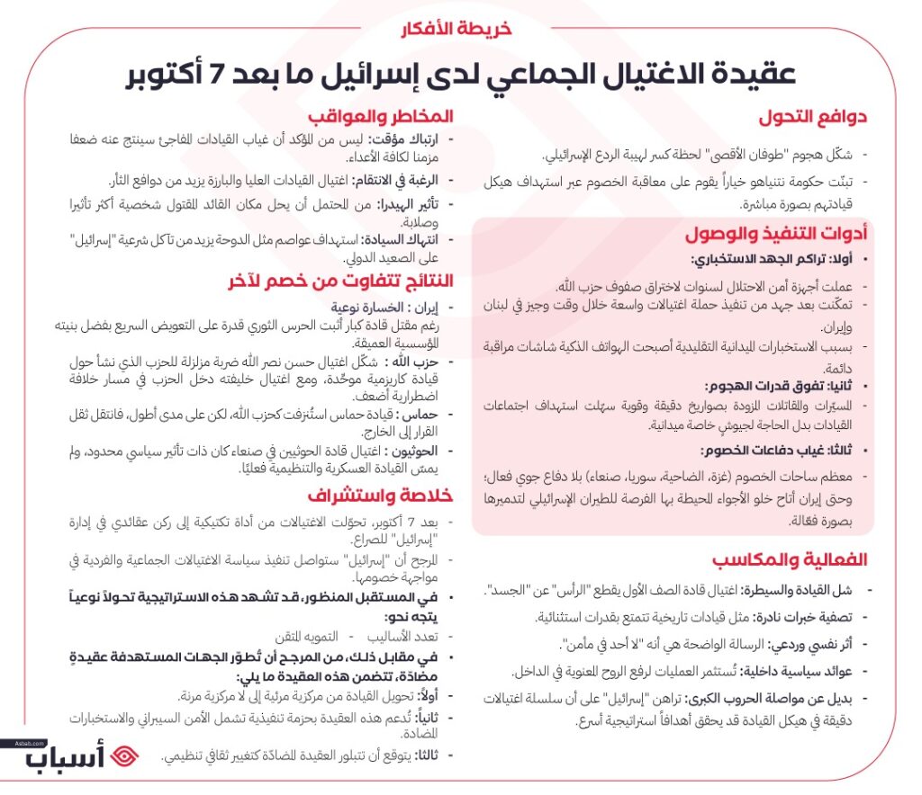 ● أصبح الاغتيال الجماعي لهيكل قيادة العدو أداة مركزية في الحرب الإسرائيلية وربما في عقيدة الأمن الإسرائيلية على المدى البعيد. إذ انتقلت “إسرائيل” بعد السابع من أكتوبر من ممارسة الاغتيالات الفردية بحق رموز النضال الفلسطيني والقادة الميدانيين الذين لهم تأثير كبير – والتي مثّلت جزءاً راسخاً من عقيدتها الأمنية تاريخيا –، إلى ما يمكن وصفه بعقيدة الاغتيال الجماعي، فلم يعد الاستهداف موجها لشخص بمفرده، بل إلى هيكل القيادة كاملا: السياسية والعسكرية والأمنية.